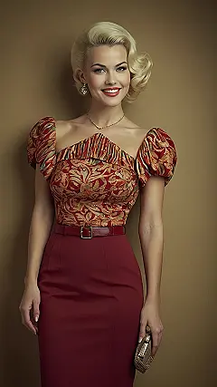 **Paragraph 1:** Wowza! Check out this amazing outfit! It’s giving major retro vibes, like something straight out of a vintage fashion magazine. The floral blouse is totally rad – it’s got those groovy 70s flower power feels, but with a modern twist. And that burgundy skirt? Talk about a showstopper! The high slit adds a touch of modern sassiness to the classic retro silhouette. It’s the perfect blend of old-school cool and new-school style. I bet she’s turning heads wherever she goes!