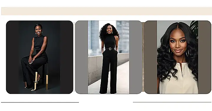 This image is all about owning your style! Our black lady is rocking a seriously stylish taupe pantsuit. It’s like a power outfit, but instead of screaming “I’m in charge,” it whispers “I’m effortlessly amazing.” The color is super chic, and the fit is perfection. This look is perfect for a job interview, a fancy dinner, or even just showing up your friends with your fabulous fashion sense. Who needs superheroes when you have a suit this cool?