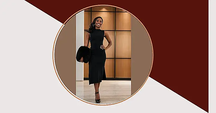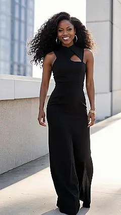 This lady is rocking a black dress that’s so sleek, it could moonlight as a superhero costume! It’s got that perfect blend of fancy and comfortable – imagine yourself strutting down the hallway at school feeling like a total queen. That gorgeous cut-out detail? Genius! It adds just the right amount of “wow” without being too over-the-top. Plus, her amazing hair? It’s like a halo of sunshine mixed with midnight magic. Seriously, this is what “black lady outfits” goals are made of!