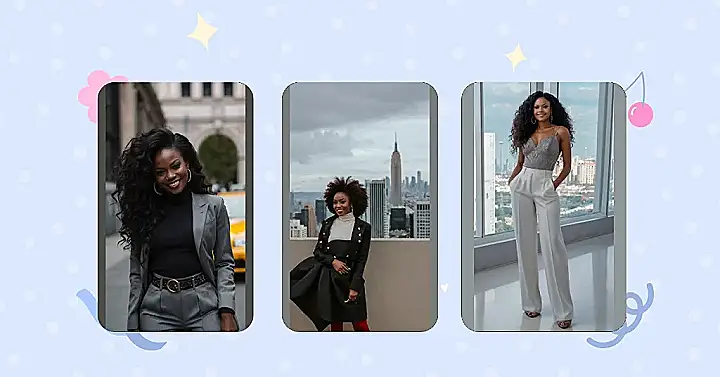 This image is all about owning your style! Our black lady is rocking a seriously stylish taupe pantsuit. It’s like a power outfit, but instead of screaming “I’m in charge,” it whispers “I’m effortlessly amazing.” The color is super chic, and the fit is perfection. This look is perfect for a job interview, a fancy dinner, or even just showing up your friends with your fabulous fashion sense. Who needs superheroes when you have a suit this cool?