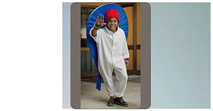 Even though the person isn’t actually covered in blue paint, the giant blue disc behind them gives a playful nod to the famous performance group. The bright red hat and the friendly smile adds a touch of silliness, making this costume a perfect example of how to be funny and festive without being too scary!