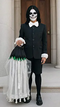 This Halloween, ditch the boring ghost costume and step into the spotlight with a laugh-out-loud funny and unique idea! Imagine being a skeleton all dressed up in a classic tuxedo, with a white bow tie and a super-serious expression. It’s like the ultimate spooky groom, ready to tie the knot with death itself! But hold on, there’s a hilarious twist! This skeleton isn’t alone. He’s got a whole team of skeletons, all dressed in the same tuxedo, hiding under his flowing white “dress” – they’re his skeleton groomsmen! Just picture the look on people’s faces when they realize the groom is a spooky skeleton, and his groomsmen are hiding beneath him!