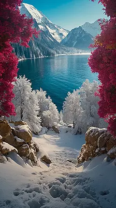 This picture is like a postcard from a magical land! Imagine stepping into a snowy wonderland where vibrant pink trees frame a crystal-clear lake nestled between majestic, snow-capped mountains. It’s so breathtaking, you’d think it’s a scene straight from a fantasy movie – definitely wallpaper-worthy! You almost expect to see tiny snow creatures peeking out from behind those frosty trees, right? It’s the perfect blend of winter chill and vibrant color; a real feast for the eyes!