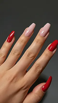 But hold up, the party isn’t just red! Look at the cool accent nails – those soft pinky-nude ones with delicate little designs that look like tiny flowers or swirly leaves. It’s like the bold red is the main act, and these are the awesome supporting characters, adding a touch of ‘nature decided to paint on your nails’. Mixing the fierce red with the gentle designs is a totally genius move for spring, making these ‘red spring nails’ perfect for showing off your style while you wait for warmer weather.