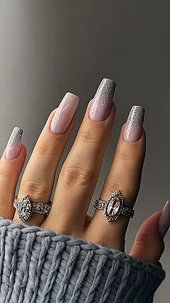 Those nails are seriously next level! It’s like they’re ready for a fancy party in space, but also super comfy chilling in a sweater. The way the glitter fades in is so cool, it’s like a magical ombre effect. I bet typing on your phone is way more glamorous now, and think of all the awesome TikToks you could make showing off those sparkly tips!