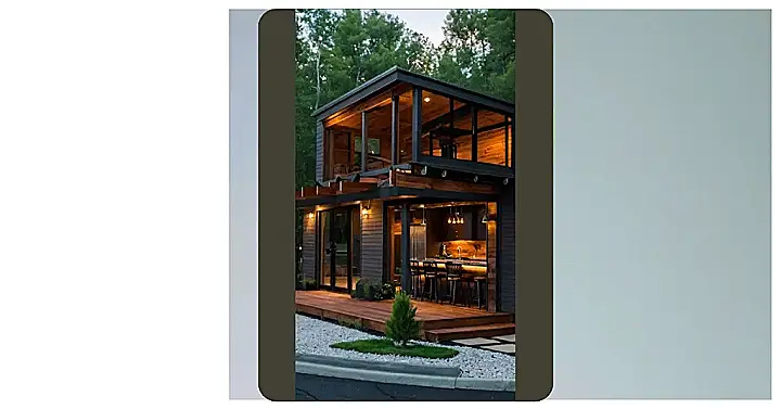 Imagine this: you’re curled up on a comfy chair inside a super-cute wooden house, warm lights twinkling all around. It’s cozy and compact, like your own personal fairy tale, but way cooler. This barndominium—it’s basically a barn that’s been super-stylishly turned into a home— is perfect for snuggling up with a good book or having a movie marathon with friends. Even your dog seems to love it! It’s the perfect blend of rustic charm and modern comfort, all nestled in a peaceful woodland setting. Who needs a giant mansion when you can have this?