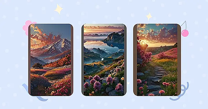 This isn’t your grandma’s wallpaper; this is an awesome explosion of color and serenity! Imagine strolling through a field of glowing flowers at sunset, with majestic mountains reflected in a crystal-clear pond. It’s like a magical painting come to life, perfect for making your phone or computer screen a little less boring and a whole lot more fantastical. Seriously, just looking at it makes you want to grab a marshmallow and roast it over an imaginary campfire!