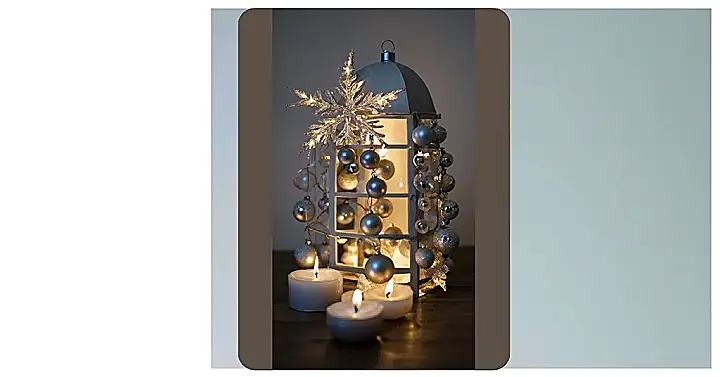 This picture shows a super easy and sparkly DIY Christmas decoration! It’s seriously simple – just grab an old lantern (or a pretty box!), some silver ornaments, some battery-operated fairy lights, and a few tea lights. Bam! You’ve got yourself a dazzling centerpiece that’s way cooler than anything you’d find in a store. It’s like a mini, glowing winter wonderland, perfect for adding a touch of festive cheer to your home without breaking the bank or spending hours crafting.