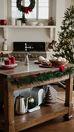 And don’t even get me started on the shelves! They’re bursting with festive decorations, from miniature Christmas trees to wreaths and pinecones. It’s a delightful mix of natural elements and holiday cheer. The whole scene screams cozy Christmas vibes—the kind that makes you want to grab a mug of hot cocoa and settle in for a night of holiday movies. It’s Christmas kitchen goals, for sure!