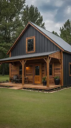 Forget those giant, scary barns that might have ghosts (probably not, but still). We’re talking about a *small* barndominium like the one in the picture. It’s got the awesome wood look of a barn but is totally set up for comfy living, maybe without any farm smells. Think cozy, not dusty! It’s basically taking the coolest parts of a barn – the open space and sturdy vibes – and shrinking them down into a seriously cool house with a giant porch perfect for hanging out.
