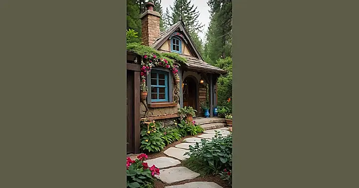 This charming little cottage looks like it jumped right out of a fairy tale! With its crooked roof, cute little windows, and stone walls, it’s like something you’d see in a storybook. You can practically picture a friendly gnome popping out of the bushes, or a talking cat sitting on the porch waiting to share a secret. It’s the kind of place where adventures start and dreams come true.