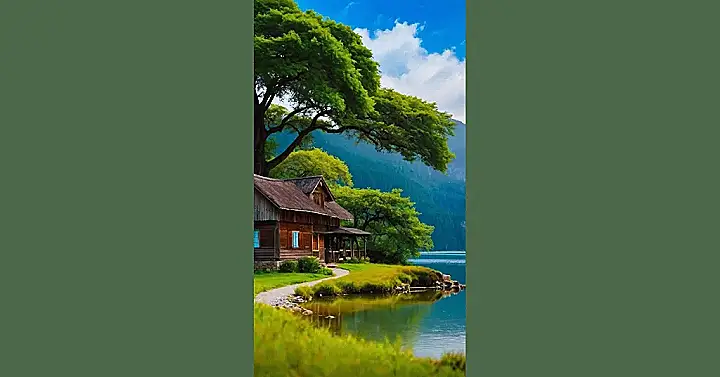 This image is like a scene straight out of a fairy tale! Imagine waking up in that cozy cabin, surrounded by towering mountains and a sparkling blue lake. The air would probably smell like pine trees and wildflowers, and you could hear the gentle chirping of birds. It’s a place where you could forget about all your worries and just relax in the beauty of nature. You might even be tempted to grab a fishing rod and spend the whole day by the lake, hoping to catch the biggest fish ever!