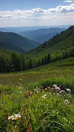 Seriously, though, this picture makes me want to pack a backpack, grab some trail mix, and go on an adventure! It’s all about those stunning mountain top views, and how much they make you feel small but also incredibly awesome at the same time. Who needs a filter when nature creates such beautiful scenes? It’s like a painting come to life, with all that gorgeous green and those amazing flowers! It makes you wonder what adventures await around every bend in that little stream… and maybe what kind of snacks you should bring for the next part of your journey.