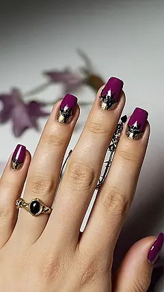 These nails are so fierce, they’d make a scarecrow jealous! With their rich purple base and fancy gold accents, they scream “Fall Fashion” – but in a totally cool way, not like a, well, you know, scarecrow. Imagine these nails at a Halloween party – they’d be the talk of the town! And just think, if a real scarecrow had nails this amazing, it would totally scare the crows away! (Maybe they’d be too busy admiring the awesome nail art.)