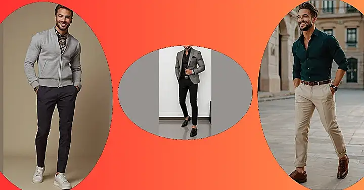 That guy’s got style! He’s rocking a seriously cool casual look – a comfy grey zip-up jacket, sharp pinstripe pants, and clean white sneakers. It’s like he just stepped out of a fashion magazine, but also looks ready to chill with friends. See? You don’t need a tuxedo to look awesome. This outfit is all about that perfect balance of relaxed and refined— proving that casual can still be seriously stylish. It’s the kind of outfit you can wear to a coffee date, a casual hangout, or even a relaxed family dinner.