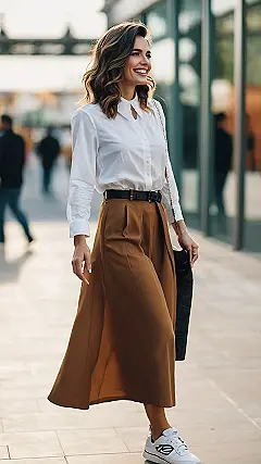 This girl is rocking an outfit that’s as cool as a cucumber! She’s got a simple white shirt, which is like the blank canvas of fashion, and she’s totally making it her own with that stylish brown skirt. It’s like she’s saying “I’m comfortable, I’m confident, and I’m ready to take on the day!” Her smile is as bright as her outfit, and it’s totally contagious. It makes you want to skip down the street and feel good about yourself, too!