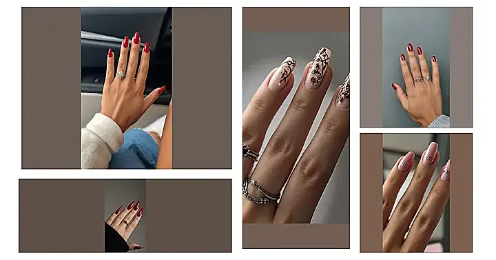 Those nails are seriously striking! That dark wine red is like the color of a vampire’s favorite juice box (if vampires drank juice boxes, which is a totally valid question!). They’re long and pointy, perfect for accidentally poking someone if they ask for a manicure selfie—just kidding (mostly)! The ring matches the red perfectly. They look so elegant, but also ready to conquer the world, one perfectly painted nail at a time.