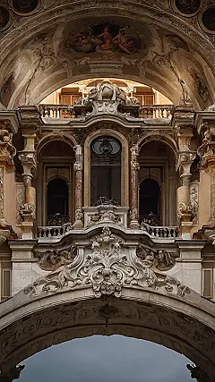 Imagine a grand palace with towering columns and arches that seem to stretch on forever. This is the world of Baroque architecture, a style known for its grandeur and dramatic details. This picture shows a glimpse into that world – a palace with beautiful, curvy arches and ornate details. It’s like walking into a scene from a fairytale, except instead of talking animals, there are just lots of fancy stonework!