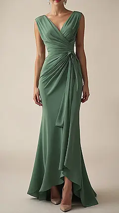 Look at this dress! It’s so fancy, it probably has its own security detail. This green stunner is the kind of ‘mother’s dress’ that signals a major event is happening, like a wedding or a fancy party where appetizers are served on tiny spoons. Your mom shows up in this, and suddenly you’re like, “Who is this glamorous person, and what happened to the one who wears crocs?” It’s got all the dramatic drapes and folds, probably perfect for making a grand entrance or maybe just trying to discreetly sneak an extra dinner roll.