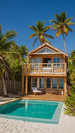This cute cabana is surrounded by tall palm trees that sway gently in the breeze. The thatched roof provides shade from the sun, and the wooden deck is perfect for soaking up the rays. You can almost feel the warm sand between your toes, right? With two comfy loungers, this is the place to kick back, relax, and let the worries of the world melt away. Just imagine all the fun you could have building sandcastles, swimming in the ocean, or just reading a good book while sipping on a tropical drink! Beach life is the best life!