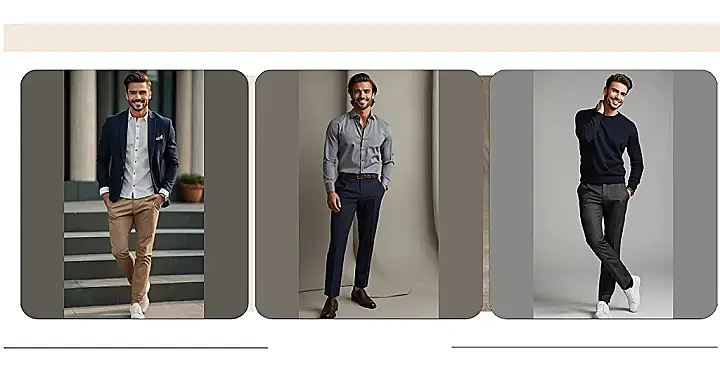 This guy in the picture looks like he just crushed a board meeting or maybe just decided to look awesome leaning against a wall. His men’s business outfit is spot-on – a crisp white shirt, sharp tan pants, and the jacket just casually slung over his arm like he doesn’t even need it to look important. It’s the kind of look that says, “Yeah, I handle things, but I also know how to look good doing it.” It’s way cooler than those stiff suits where you feel like you can barely move your arms.