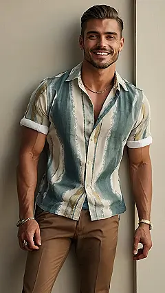 Want to ditch the boring tees and cargo shorts this summer? This dude’s got the right idea! Rocking a breezy button-down shirt and tan pants, he looks ready for anything, from a chill beach hangout to a slightly fancy backyard BBQ. Think of it as leveling up your summer game without trying too hard – because let’s face it, nobody wants to look like they spent all day planning their outfit for a casual cookout.