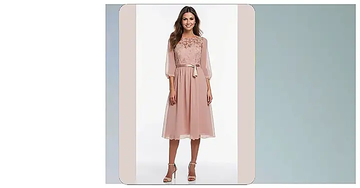 This dress totally looks like the one your mom pulls out for those ‘important’ family events, right? Like when she suddenly transforms from sweatpants queen to sophisticated lady in approximately five minutes. You blink, and BAM, she’s got on this flowy, pretty pink number with fancy lace bits, looking all elegant and smiley, just like the person in the picture. It’s enough to make you double-take and wonder who replaced your actual mom with this glamorous imposter.