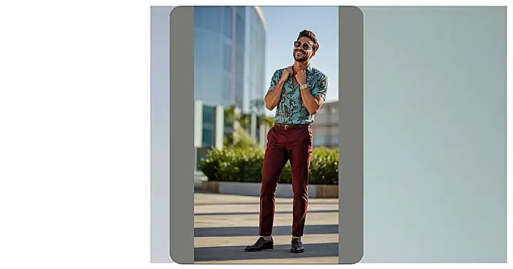 This guy’s totally rocking the “mens Bold Print Shirt outfit” thing! Check out that awesome teal shirt – it’s like a tropical vacation exploded onto fabric. He’s paired it perfectly with those rich burgundy pants, proving that sometimes opposites really *do* attract. The whole look is effortlessly cool, like he just stepped out of a fashion magazine – and maybe grabbed a quick iced coffee before the shoot.
