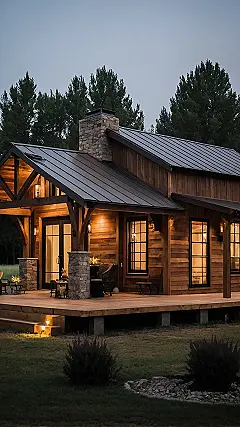 Forget those giant, scary barns that might have ghosts (probably not, but still). We’re talking about a *small* barndominium like the one in the picture. It’s got the awesome wood look of a barn but is totally set up for comfy living, maybe without any farm smells. Think cozy, not dusty! It’s basically taking the coolest parts of a barn – the open space and sturdy vibes – and shrinking them down into a seriously cool house with a giant porch perfect for hanging out.