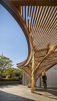Seriously though, who needs a boring old umbrella when you can have this masterpiece? It’s not just practical, it’s practically art! The way the light filters through those wooden slats makes the coolest shadows. Plus, it totally proves that even architecture can be fun and playful, like a giant wooden jungle gym for your imagination!