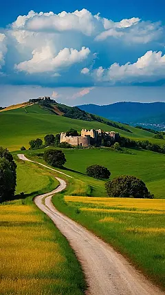 Someone definitely put some serious work into making this landscape picture-perfect. It looks like the kind of place where you’d expect to see a family of bunnies hopping around, or maybe even a wise old wizard chilling by a creek. And that winding path? Totally begging you to go explore, even if it just leads to more awesome scenery and maybe a few grass stains. It’s the real deal, no filters needed!