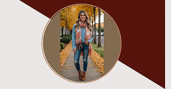This girl is totally rocking the “casual dinner outfit” look for fall! She’s got the perfect mix of comfy and stylish, with her jeans, boots, and a super cute scarf. That scarf is the perfect way to add a pop of color and warmth to her outfit, just like those beautiful autumn leaves around her. It’s like she’s ready for a cozy night out with friends, maybe at a pumpkin patch or a bonfire!