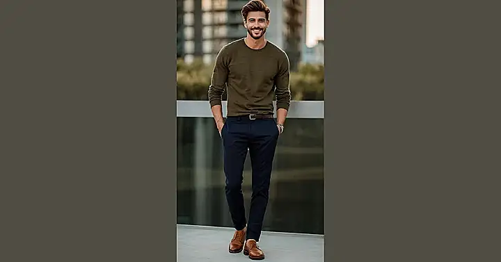 This guy’s outfit is seriously smooth! He’s rocking a look that’s perfect for hanging out with friends, going to a casual date, or even just impressing your teachers (don’t tell them we said that!). Dark pants and a comfy olive green sweater are a match made in heaven – it’s like the sophisticated sibling of your favorite pajamas. Those brown shoes? They’re the cherry on top, adding a touch of grown-up style without being too stuffy. Think of it as “casual cool” taken to the next level!