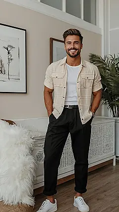 Forget stuffy suits and ties! This outfit proves that you can look sharp and feel comfortable without trying too hard. It’s all about the little details, like the way his pants are slightly cuffed at the ankles, showing off those crisp white shoes. The beige shirt adds a touch of effortless style that’s both sophisticated and playful – perfect for making a great first impression. He’s the image of relaxed confidence, and that’s a look anyone can rock with the right pieces.
