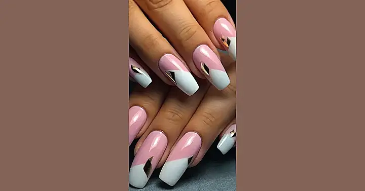 These nails are like a tiny, stylish party on your fingertips! They’re rocking that cute pink and white combo, but with a cool geometric twist. It’s like someone took a classic French manicure and gave it a super fun, modern upgrade with those shiny gold bits. Who needs to wear jewelry when you can have mini-gold nuggets stuck to your nails?!