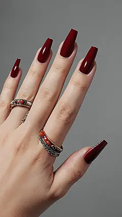 This picture screams “I’m ready for anything!” with those bold red nails. They’re like a superpower for your fingers, making you feel confident and unstoppable. But what really makes this look awesome are those awesome rings! They’re all different, just like you, and they add a touch of magic to the whole look.