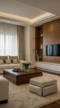 This living room is seriously fancy! Imagine sinking into that comfy sofa after a long day, maybe with a giant tub of popcorn and your favorite movie playing on that massive TV. It’s like stepping into a magazine spread‚Äîall soft textures, sleek lines, and enough wood to build a small cabin. The lavish home decor is totally on point, from the elegant curtains to the oh-so-stylish coffee table. It’s the kind of place where you could accidentally spill your juice and still feel too sophisticated to care.