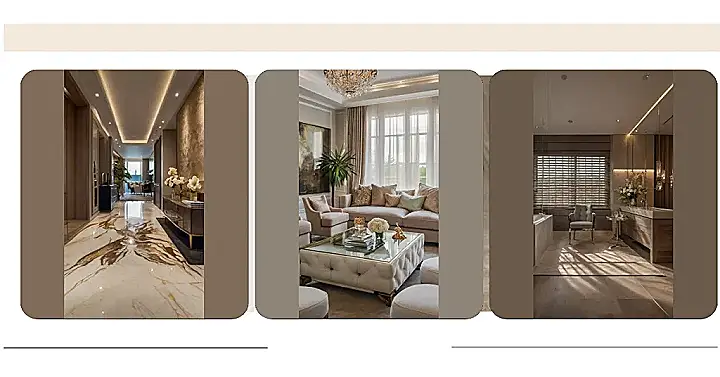 This living room isn’t just fancy; it’s like stepping into a sparkly, grown-up fairytale. Imagine sinking into those unbelievably plush sofas after a long day, maybe with a giant mug of hot cocoa. The chandelier is absolutely dazzling ‚Äì it practically screams “lavish home decor,” doesn’t it? And those gold wall pieces? They look like some super-cool, artistic puzzle pieces. You could totally get lost in this room just admiring the details!