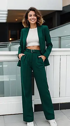 This outfit is a total vibe! The green pants and matching blazer are seriously chic, and the white crop top adds just the right amount of casual coolness. It’s like saying, “I’m confident and stylish, but I’m also not afraid to be comfy.” Imagine yourself wearing this outfit to a party or a date. You’d be the envy of everyone in the room, literally!