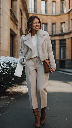 This outfit is seriously goals! Imagine strolling through a snowy Parisian street (because why not?) looking this effortlessly chic. That fluffy cream coat is like a hug for your body, perfect for keeping out the winter chill while still looking totally stylish. The matching trousers and cute brown boots complete the look, proving that comfort and style can totally go hand-in-hand. Who needs a superhero cape when you’ve got this?