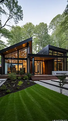 Imagine playing hide-and-seek in this house! It’s like a giant, super-stylish jungle gym. With those massive windows and sleek lines, it’s totally modern, like something out of a sci-fi movie, but in a good way. Forget building a pillow fort, you could practically build a castle in that living room! The wooden steps leading up to the door are pretty awesome too, almost makes you want to skip instead of walk.
