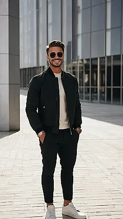 This guy knows how to dress for winter! Check out his super cool bomber jacket. It’s perfect for keeping the chills at bay. And his stylish black pants and white sneakers? Those are the kind of shoes that could make you want to run around the block (even in the snow!). The only thing missing is maybe a cozy scarf or beanie, but he’s still got the winter fashion game on lock.