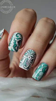 Forget sparkly reindeer and Santa hats! These nails are way cooler. They’ve got this amazing teal and white swirly design – kind of like a fancy, underwater paisley pattern. It’s totally sophisticated, not at all like those super glittery Christmas nails everyone else is sporting. Imagine showing these off at the holiday party – you’d be the envy of everyone, especially your aunt who always has the most over-the-top glitter.