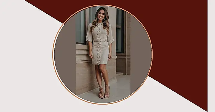 This outfit is giving major autumn vibes! The model looks absolutely stunning in her beige dress with the unique shell accents. It’s like she’s ready to walk the runway, but instead, she’s probably on her way to grab a pumpkin spice latte and some apple cider donuts. Those gorgeous lace-up sandals are the perfect touch to complete the fall fashion look, and they’re totally giving us “walking on sunshine” vibes.