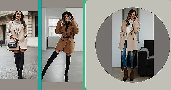 This picture shows a woman rocking a camel coat – seriously, it’s like she’s stepped out of a fashion magazine! The coat is super stylish and the color is perfect for fall or winter. Paired with those amazing over-the-knee boots, she’s totally nailed the “women camel coat outfit” look. It’s the kind of outfit that makes you want to grab a latte and stroll through a Parisian street (even if you’re just walking to school!).