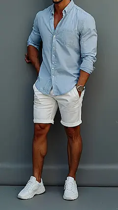 This look is like a cheat code for looking effortlessly put-together. The blue shirt and white shorts are a classic combo that’s basically never out of style. Plus, the watch makes it look like you totally planned this, even if you just threw it on before running out the door. You’ve got this!