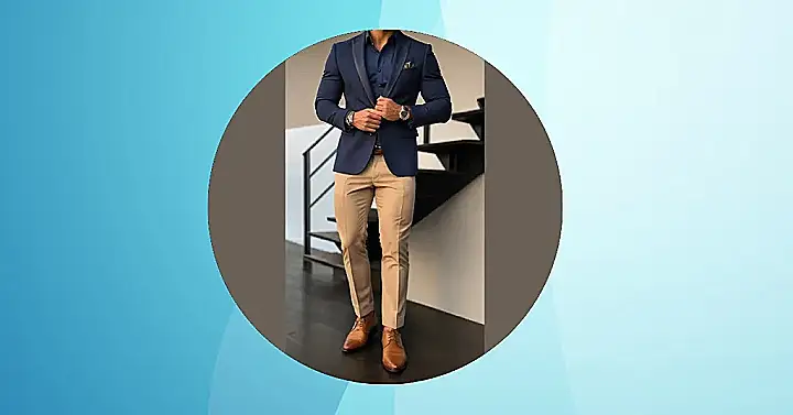 This guy’s got the whole formal look down pat! A sleek navy blazer with a contrasting black lapel, a crisp blue button-down shirt, and some seriously stylish tan pants that are begging for a dance floor. He’s definitely got that “I’m ready to take on the world” vibe going on. You can almost hear the slow jams playing in the background as he struts his stuff.