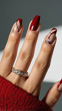 These aren’t just basic nails; they’ve got that cool little design happening, which is like the nail version of adding just the right amount of sprinkles to a cupcake – not too many, just enough to make it special. The mix of the solid red and the nude with the swirly pattern is perfect for looking fancy without looking like you tried too hard (the ultimate goal, right?). You could totally flash these nails while reaching for popcorn during movie night and people would still think, “Wow, even her popcorn grabbing is sophisticated.” They’re basically tiny art pieces that make your hand feel like it’s ready for its close-up, ring included!