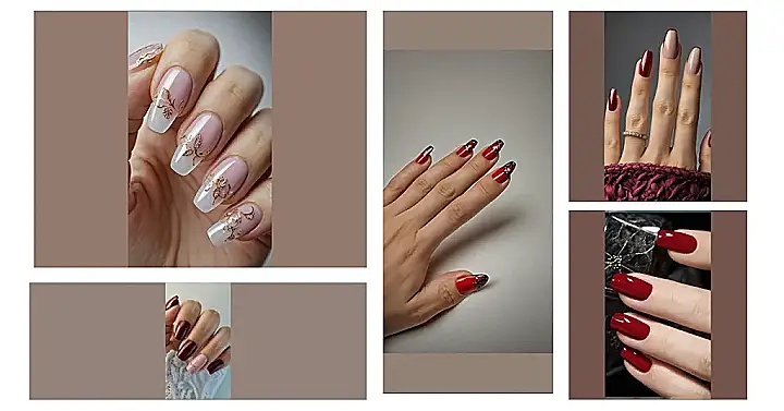 These nails are so simple and classy, they probably have a tiny butler opening doors for them wherever they go. Look at those deep red ones! They’re like the sophisticated older sibling of basic nail polish. And then the beige ones with the little red tip? That’s basically a tiny, stylish hat for your nail, ready for any occasion. You could wear these to school, to hang out, or even accidentally bump into someone important and look instantly put-together without even trying.