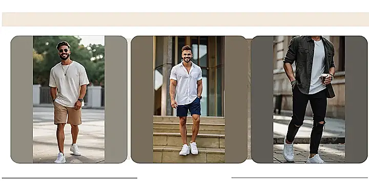 This guy’s outfit is the definition of chill. A comfy cream-colored t-shirt and some tan shorts – it’s like he just stepped out of a summer breeze. He’s rocking that effortlessly cool look that’s perfect for hanging out with friends, grabbing ice cream, or even just strolling through the park. No fancy stuff, just simple, stylish, and super comfortable. It’s the kind of outfit that screams “I woke up like this, but better!”